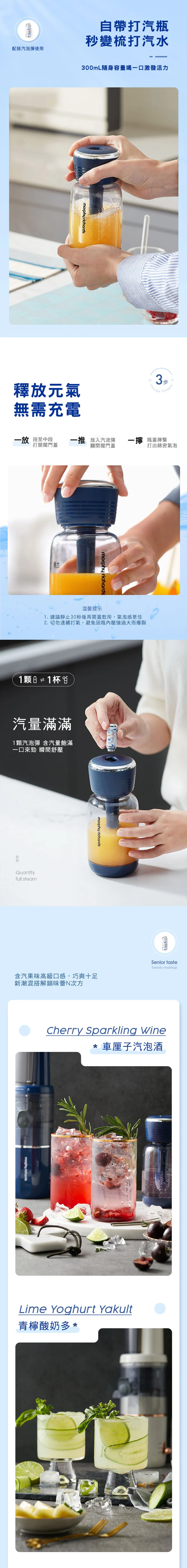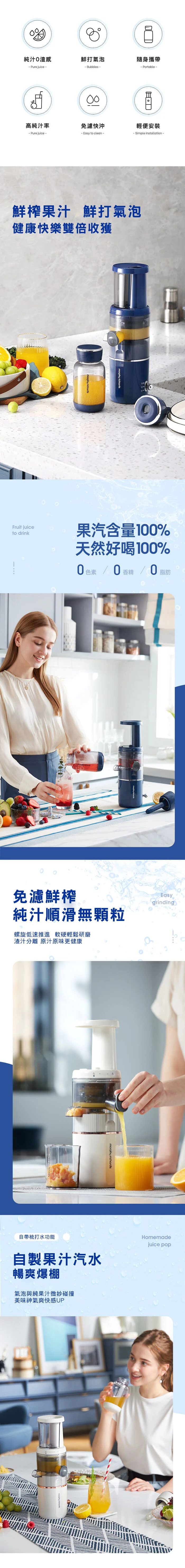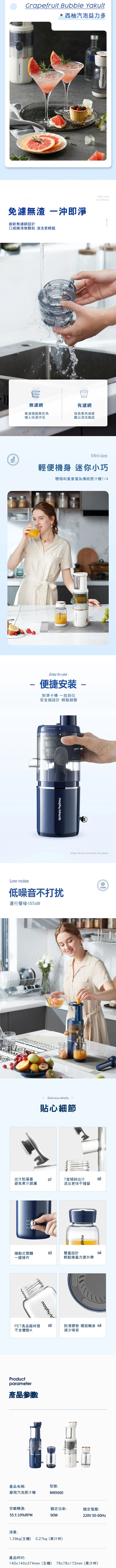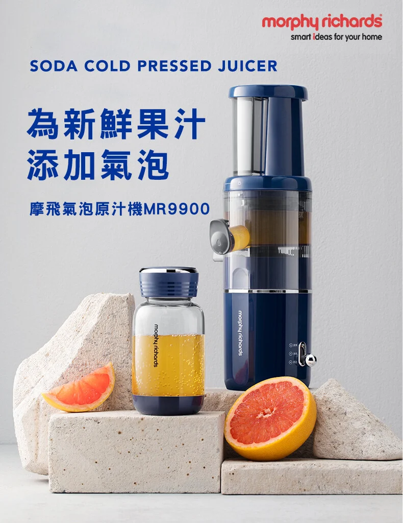 Morphy Richards MR9900多功能Soda氣泡原汁機 - 將原汁機和梳打汽水機二合一的小型家用原汁機,在常規的原汁機基礎榨汁功能上,融合氣泡梳打水功能,三步輕便充氣,口味新潮。產品採用低速鮮榨技術,渣汁分離,純汁率>90%;專利快沖洗榨汁技術,無網創新,一沖即淨;300ml容量便攜杯,氣泡果汁隨身外帶;7度傾斜出汁,流出更快速無殘留;撥動式開關,一鍵操作;一體式設計,方便收納同時,安裝簡易,對準卡槽,一扭即可。