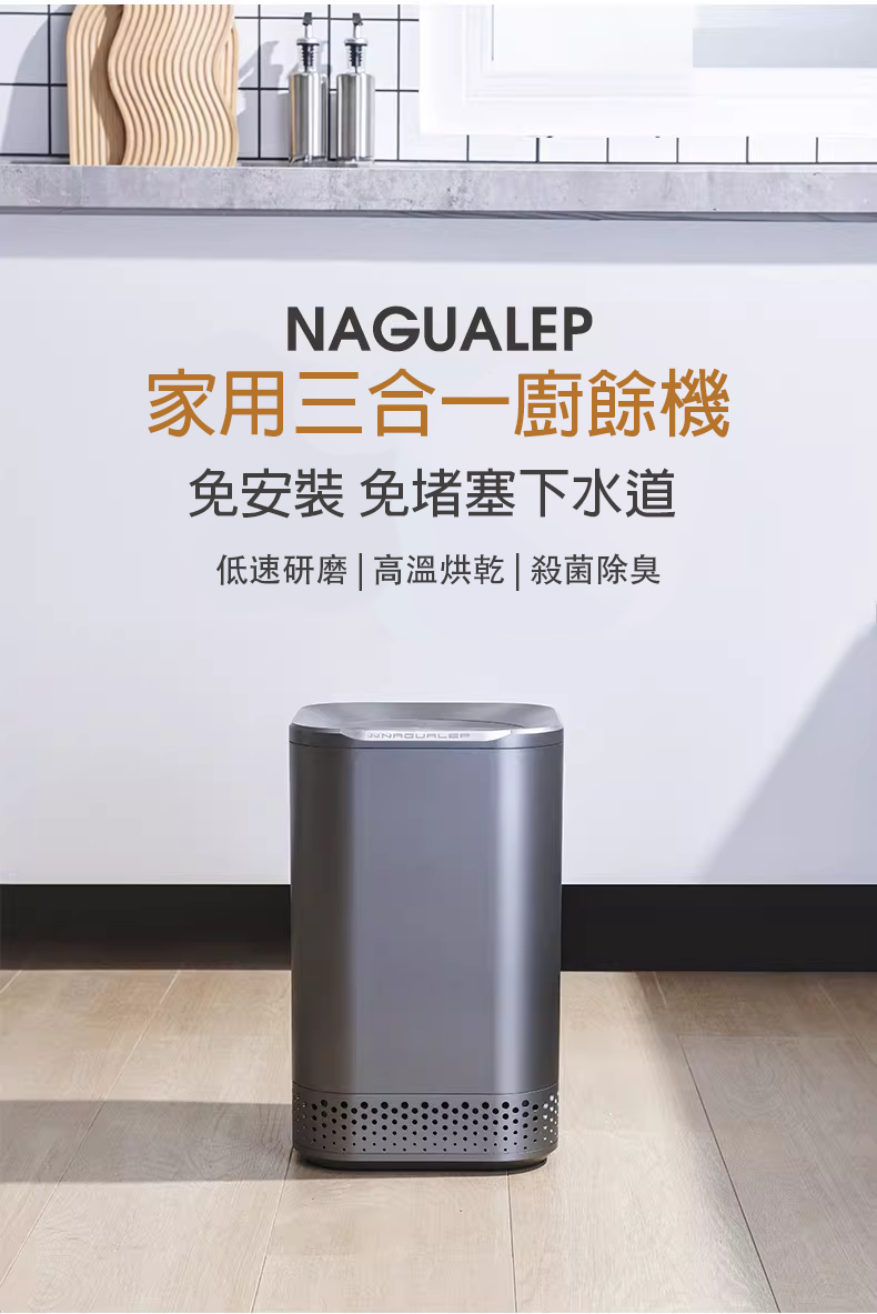 NAGUALEP 家用三合一廚餘機 ,採用高溫烘乾殺菌技術,能有效處理家中常見的蔬菜、剩飯及小份魚骨等廚餘,將其轉化為乾燥無臭土屑;同時具備活性碳濾芯去菌除臭功能,在源頭減量廚餘、為環保出力之餘,也提升居家衛生,快來試用廚餘機吧!